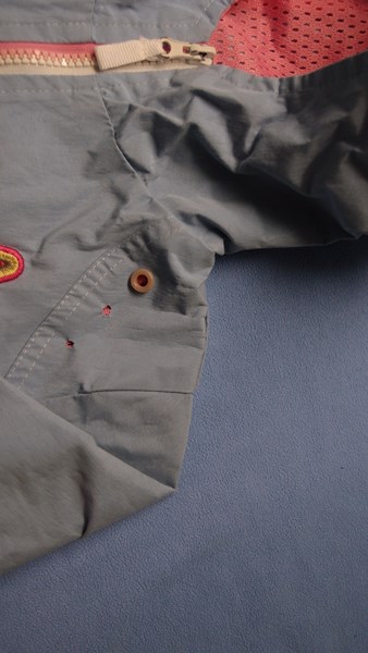 Prodám dívčí plátěnou bundičku pro dítě od 12m do 18m. U bundičky chybí dva kroužky - je vidět na detailu v druhém obrázku.